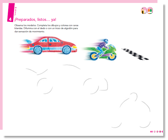 Para completar la lámina de hoy, primero se deben dibujar el coche y la moto siguiendo las líneas de ayuda para un correcto dibujo de los dos vehículos. Después, se puede colorear con ceras blandas, difuminando con un algodón o similar, extendiendo ligeramente la mancha hacia atrás para producir sensación de movimiento. Se puede ensayar en un papel aparte donde apliques una pequeña mancha de color de ceras blandas y lo extiendas con cuidado para comprobar el efecto del difuminado. Teniendo en cuenta que posiblemente no tengáis en casa ceras blandas, podéis completar la lámina con pinturas o rotuladores.