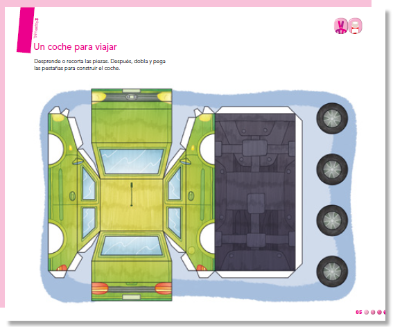 En la tarea de esta semana, tendrás que construir un coche. Te propongo que primero desprendas y recortes con cuidado las piezas grandes, doblando por las líneas que delimitan las partes del vehículo. Después recorta las ruedas. Una vez te hayas hecho una idea de cómo hay que formar el coche, empieza a pegar. Es conveniente que sujetes con los dedos hasta comprobar que ha quedado perfectamente pegado. Una vez que hayas formado el coche, pega las ruedas con cuidado.