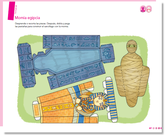 Lee detenidamente el texto explicativo que tienes en el cuadro azul de la lámina y observa las pirámides. Te propongo que primero dibujes con lápiz y regla la pirámide, teniendo en cuenta los pequeños puntos que sirven de guía. Después, colorea con lápices según el modelo que aparece bajo la fotografía.